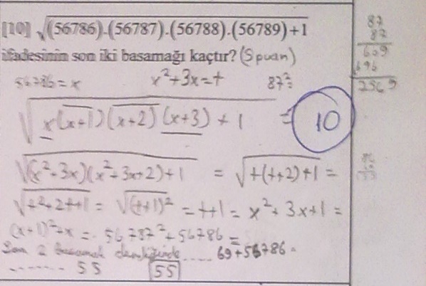 Bu soruyu öğrenci boş bırakmıştır. Olimpiyat öğrencilerinin yetiştirilmesinde her bir öğrencinin eşik değerde alt-üst sınırı bulunmaktadır. Çoğu zaman bu sınırı eğitmen de tam çözememektedir. Bu yaşlarda öğrencilere yapılacak en büyük iyiliklerden bir tanesi de öğrenciye sınır koymamaktır. Çünkü belli işlem adımlar sonucunda öğrenci eğitmeninden daha orijinal düşünce perspektifine sahip olabilmektedir(Bunu eğitimci yadırgamamalı, hayatın bir gerçeği!) Bu tarz soru modellerinin örnekleri arttırılabilir!