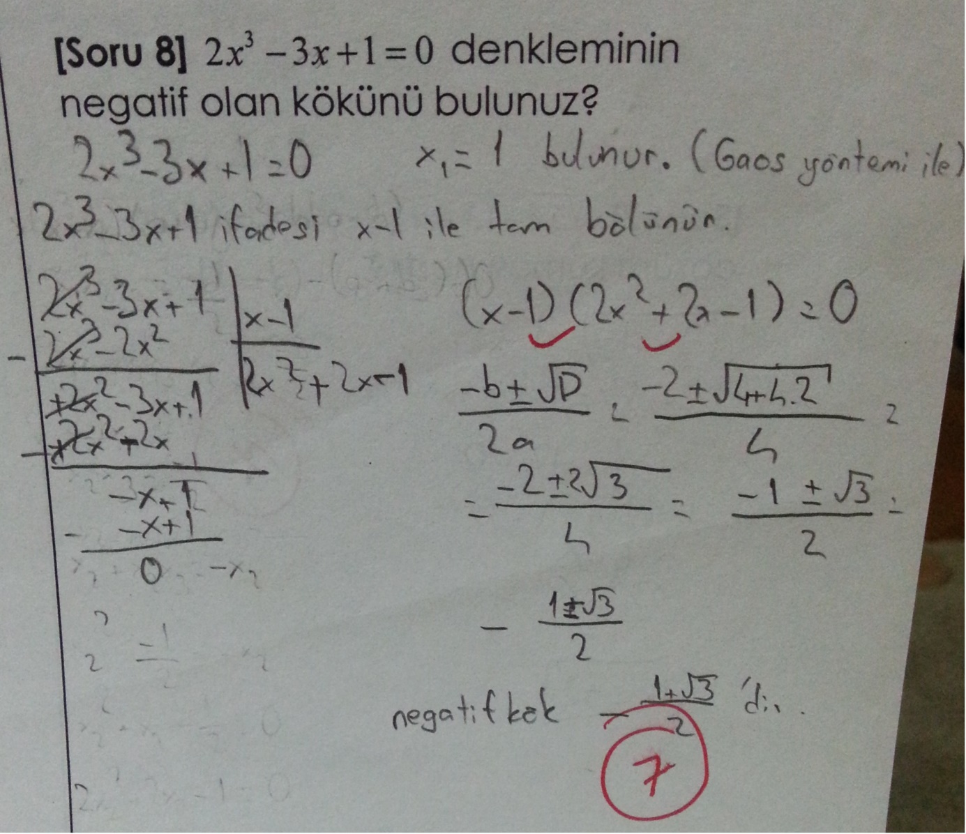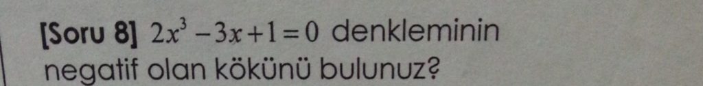 Öğrencinin diyerek devam ettiği bu çözümde rasyonel kök teoremini kullanarak (sabit sayının rasyonel çarpanlarını deneyerek) bir kökünü bulmuştur. Ardından polinom bölmesiyle derece düşürerek diskriminant yardımıyla farklı iki reel kökün bulunduğunu ifade ederek sonuca gitmiştir.