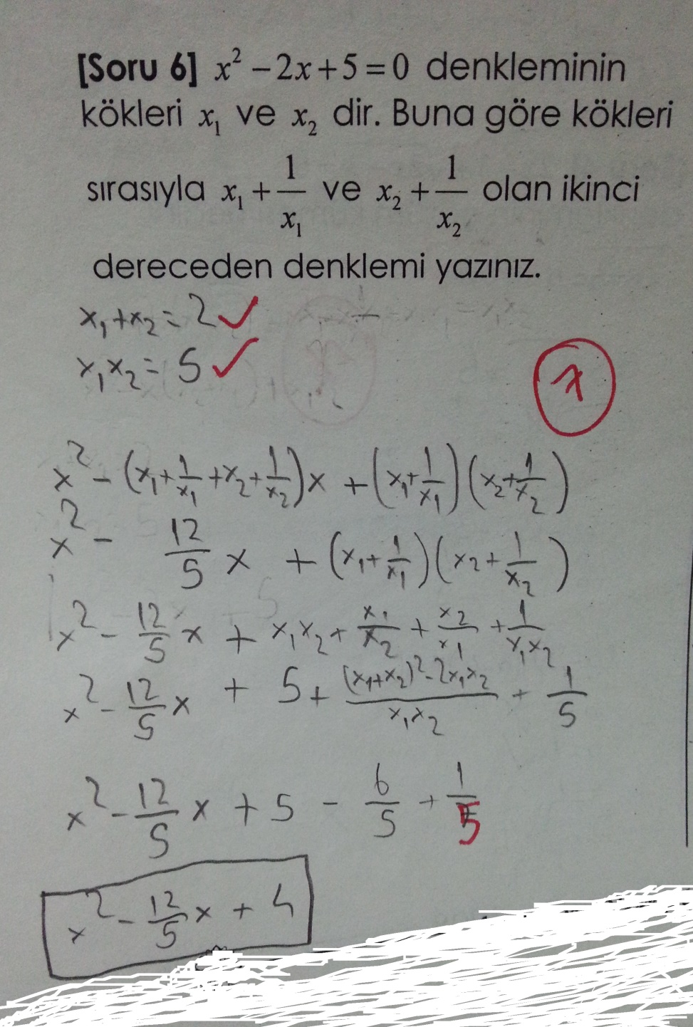 Bu soruyu cevaplandırmaya çalışacak öğrenci ikinci dereceden denklem bilgisi, kök-katsayı ilişkisi, yeniden denklem inşası, çarpanlara ayırma bilgisi gibi konulara hakim olmalıdır. Öğrencinin yaptığı çözüm aşağıdadır( her soru 7 puan).